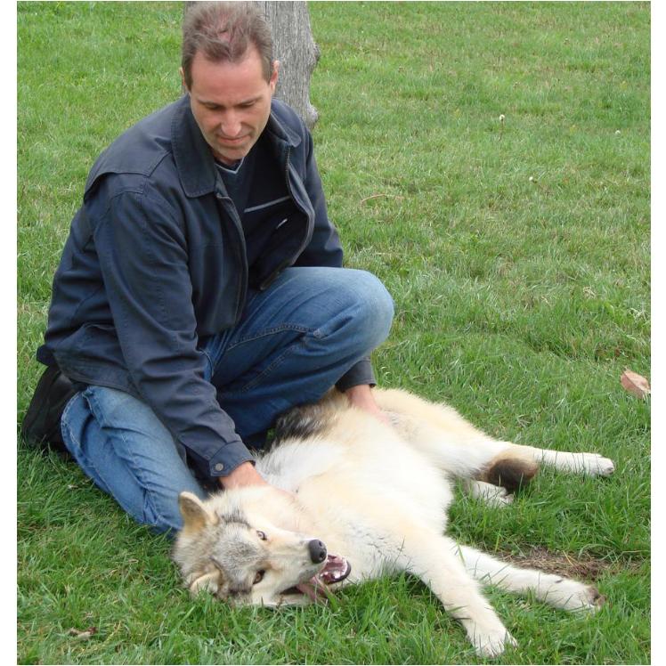 Canadian Wildlife Artist Michael Pape and a Grey Wolf named "Cheyenne".
